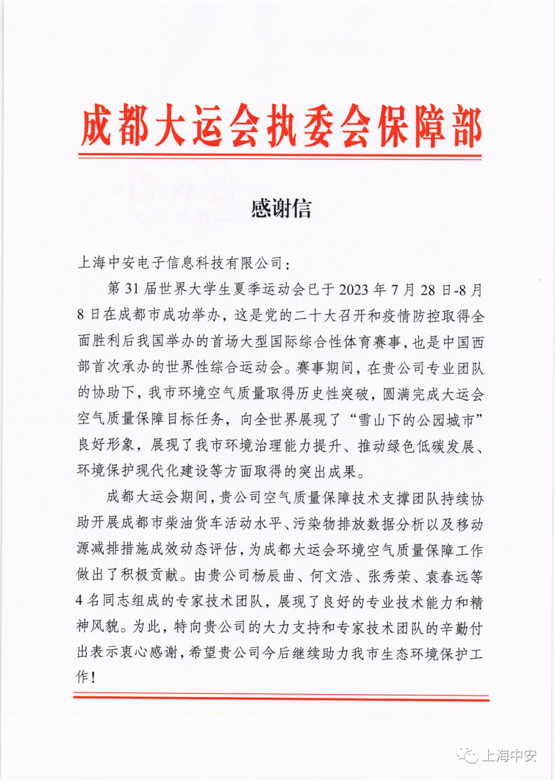 中安科技圓滿完成第31屆世界大學生夏季運動會空氣質量保障任務!(2023-10-9)